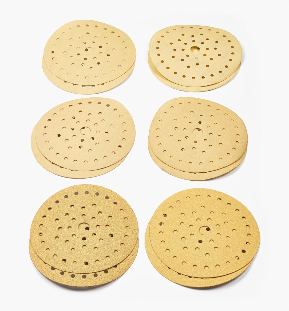 This sample pack of twelve 6″ 50-hole Gold Multifit grip discs has two discs each of 80x, 120x, 180x, 220x, 240x and 320x, priced at a saving of 20% compared to buying the discs individually.