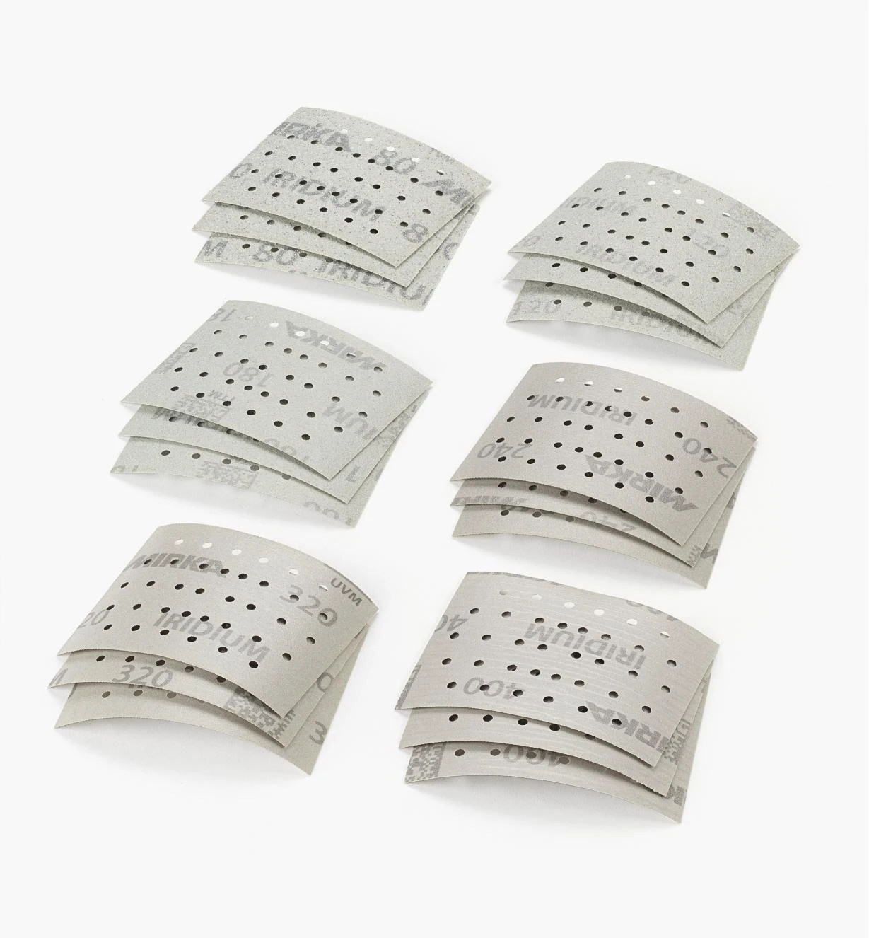 A sample package of eighteen 3″ × 4″ 36-hole Iridium grip sheets, with three sheets each of 80x, 120x, 180x, 240x, 320x and 400x, priced at a saving of nearly 20% compared to buying the sheets individually.