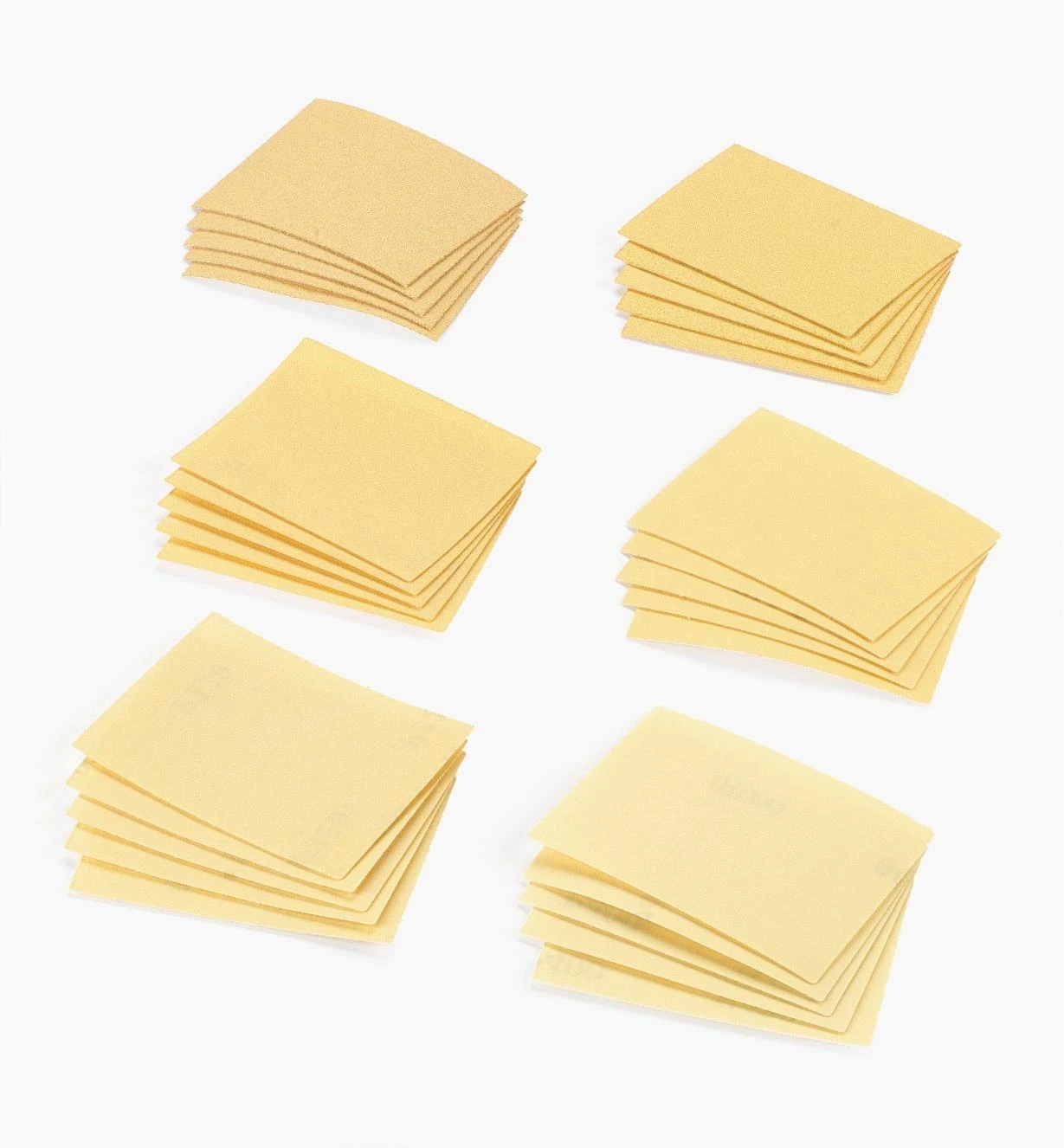 A 30-piece sample pack of 3″ × 4″ Gold grip sheets, with five sheets each of 80x, 120x, 180x, 220x, 320x and 400x, priced at a saving of nearly 20% compared to buying the sheets individually.