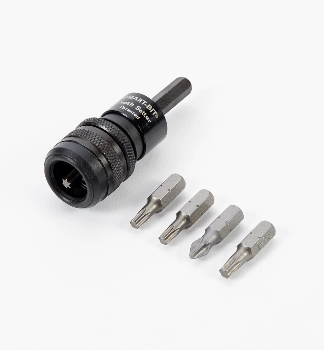 The depth setter has a 1/4″ hex shank drive. While the 1/4″ hex socket accepts any 1″ hex-shank bit, the tool comes with a #2 Phillips bit, three T-20 Torx bits and a T-25 Torx bit. Not for use with impact drills.
