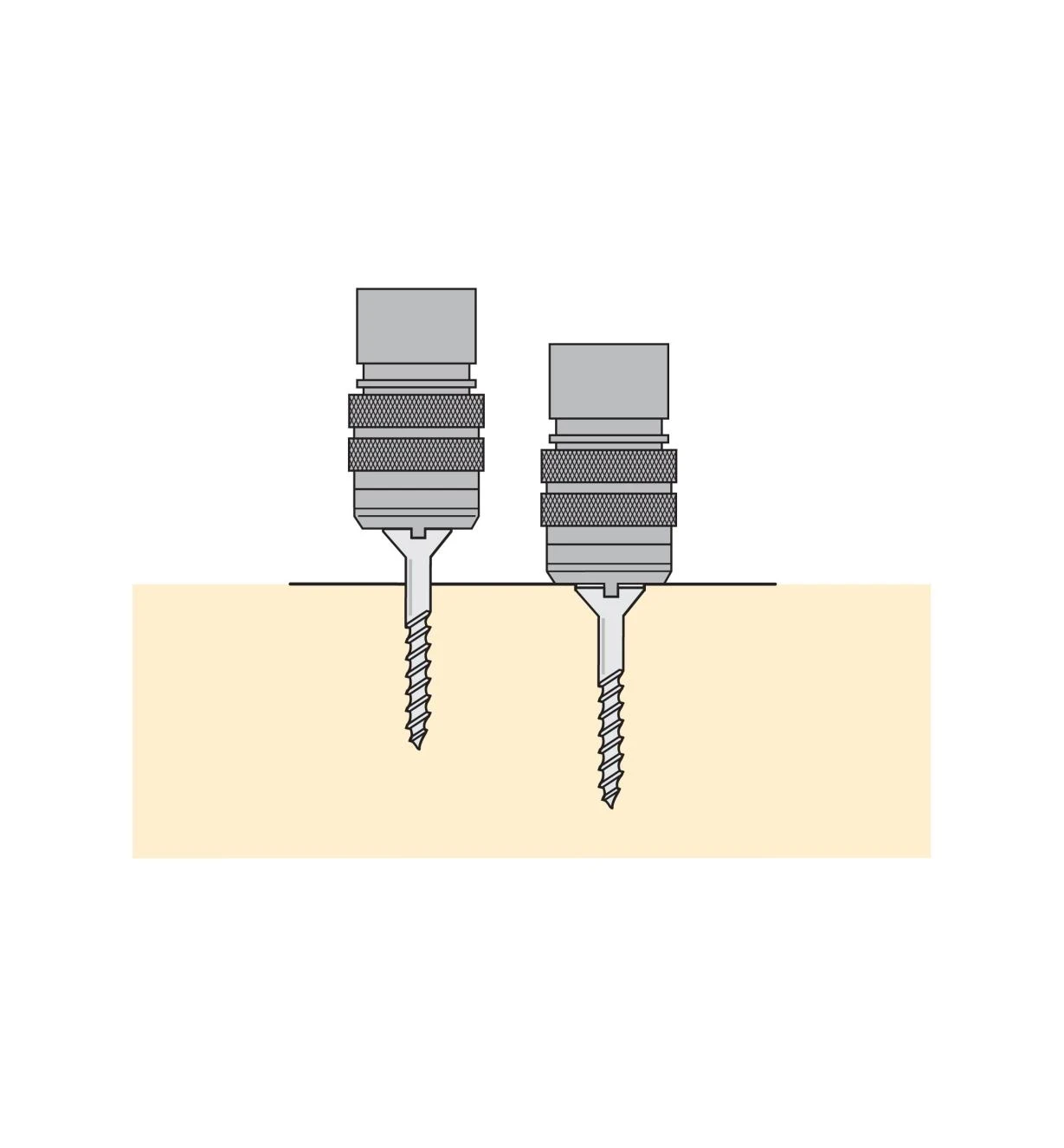 This depth setter is more advanced than it looks. It has an internal mechanism that automatically disengages the bit from the power tool’s drive when the stop collar meets the work surface. This not only prevents overdriving the screw but also protects the bit and the screw head from becoming stripped.