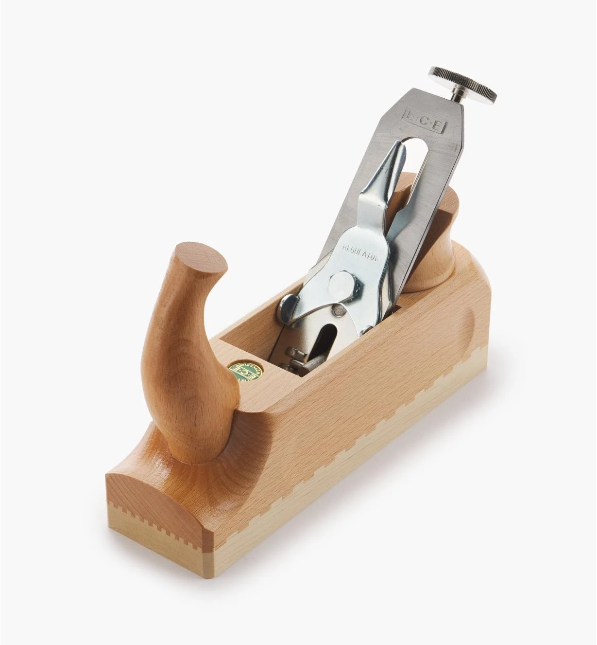 Used to smooth surfaces and remove marks left by the milling process, this 220mm (8 5/8″) long finishing plane is somewhat shorter than most steel-body smooth planes to permit more precise work. The Primus screw-feed mechanism has no lost motion, letting you adjust the blade angle and projection quickly and precisely while keeping the blade assembly in tension. The 48mm (1 7/8″) wide double iron is set bevel-down at a 50° bed angle. The plane has a beech body, a hornbeam sole and a horn-shaped handle, usable with either a right- or left-hand grip.
