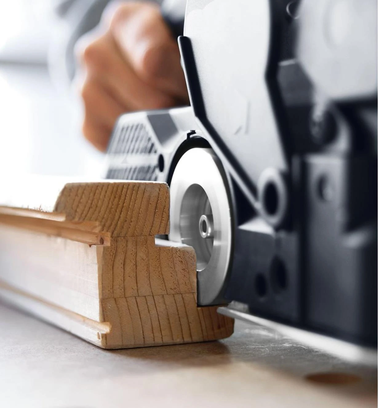 Using an electric planer right up to the edge or on rabbets can leave a lip that has to be removed by hand. The HL 850 lets you cut flush to an adjacent surface because it can plane across the entire width of the rabbet. Because the planer head is mounted to one side, it sits flush with the opposite side of the planer housing. The retractable side guard makes planing safer, and it swings up and to the side as the rabbet depth increases.