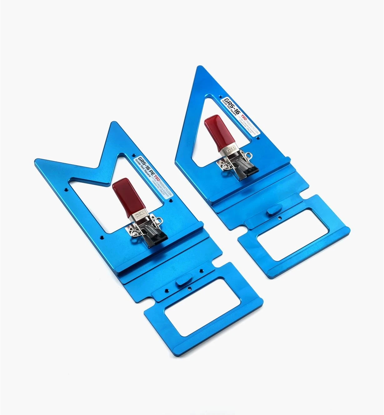 Each version simply slides into the T-slot on the underside of the rail and locks firmly in position using an integral draw clamp, which hooks onto the lip on the edge of the rail and pulls the guide rail square tightly against it. The CNC-machined anodized aluminum body provides a 15 3/4″ long, 5/8″ thick registration surface for a reliable 90° reference against a panel edge. The low-profile body won’t obstruct your movement while you make the cut, and a small notch in the underside accommodates a track-saw guide clamp.