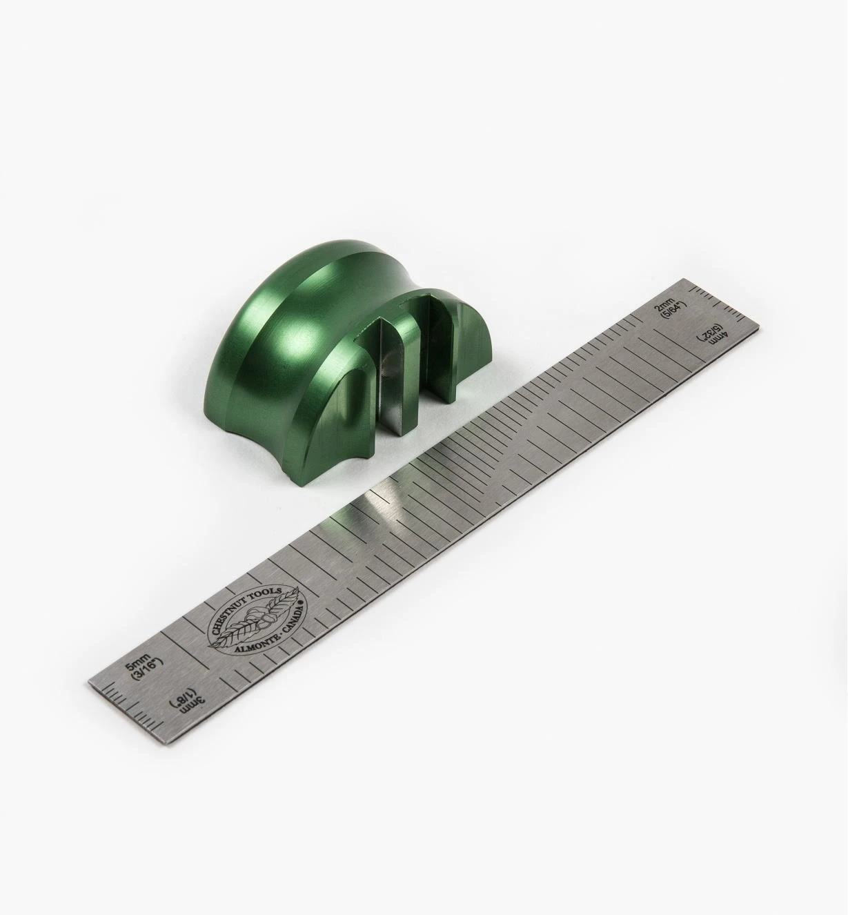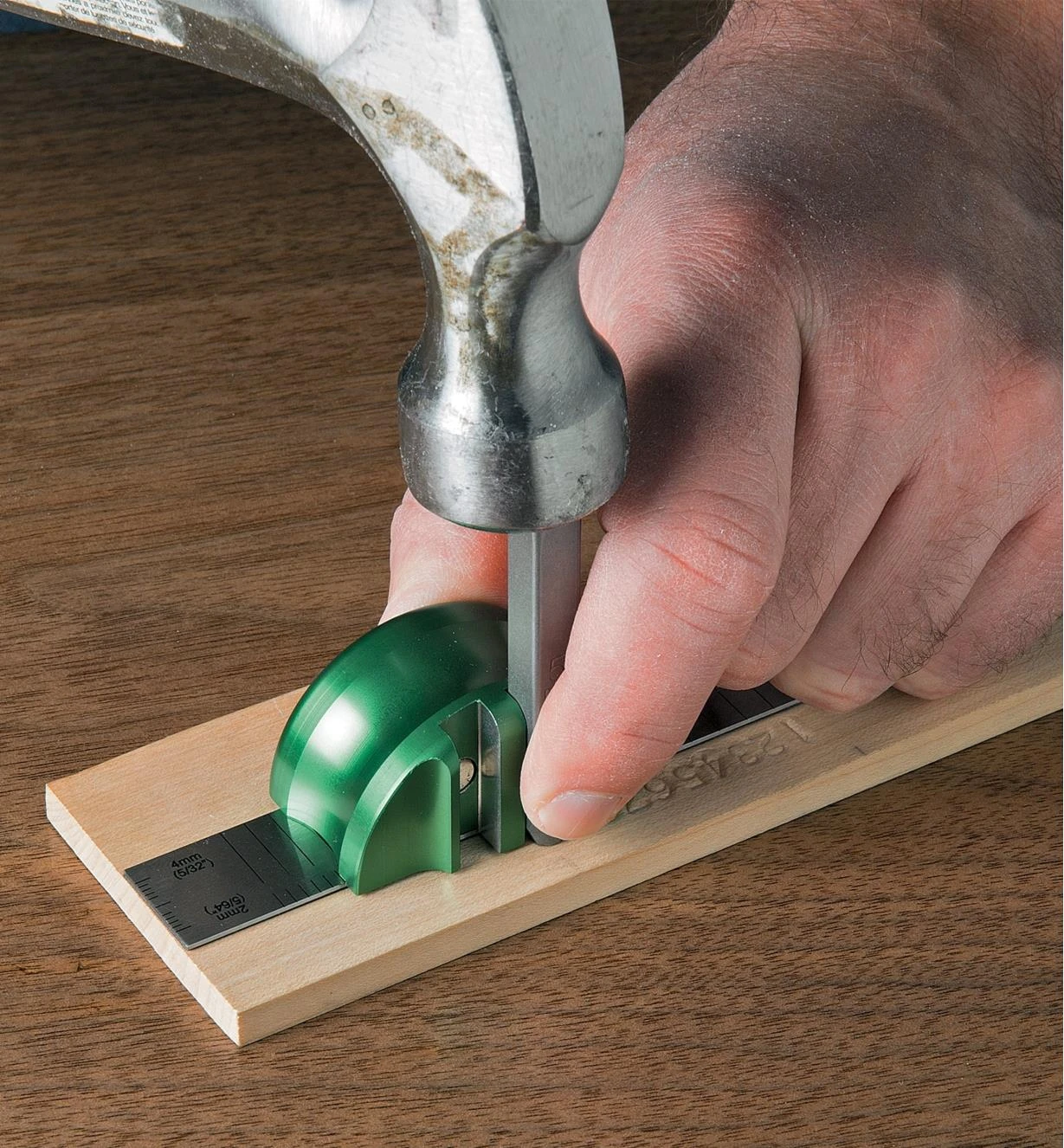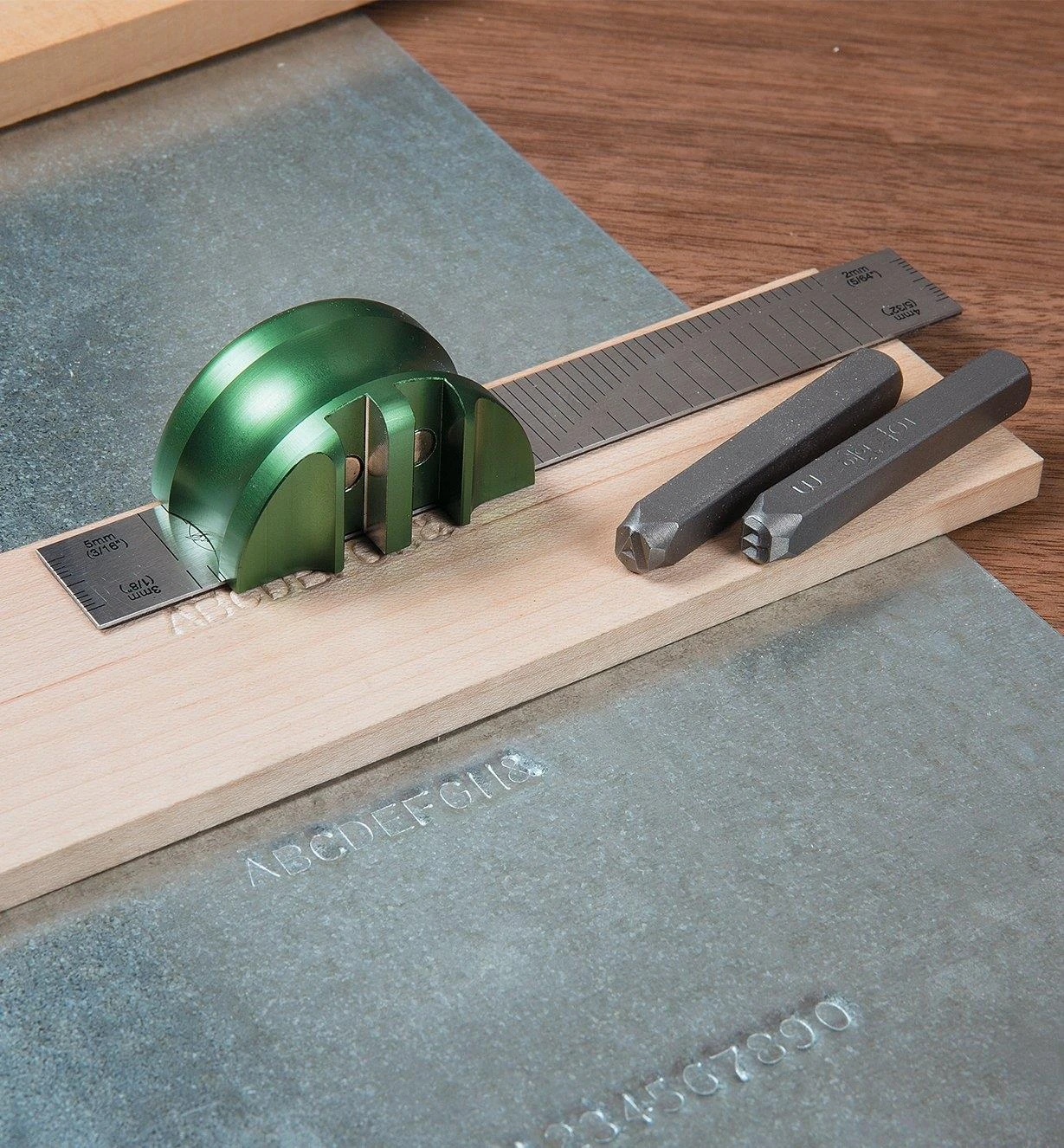 To leave your hands free to position the ruler and guide on your work, an embedded rare-earth magnet holds the ruler square to a reference edge machined on the underside of the guide, while a magnet in each slot holds the stamp firmly in the slot without restricting its downward movement when struck with a mallet.