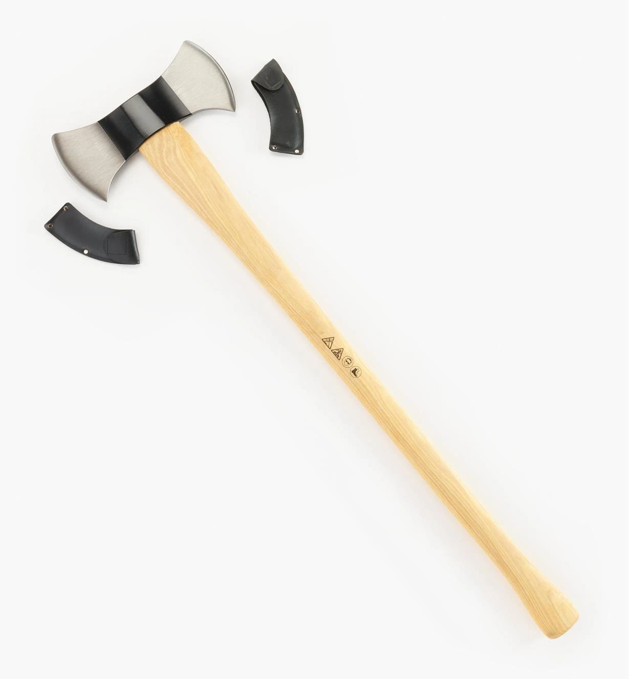This axe is used in competitions or by those who prefer the balance and feel of a double-bit axe. 10″ long, 2 1/4 lb head. Each face is 5 1/4″ wide. Hickory handle. 35” long overall.