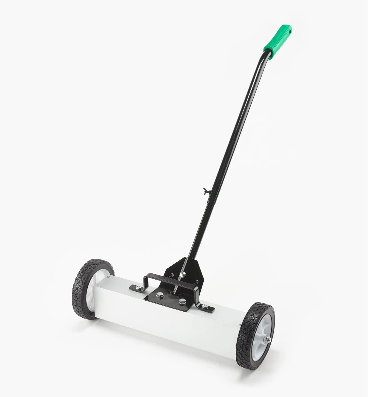 The 18″ wide body of this magnetic sweep can pick up about two pounds of material, whether it is metal shavings in a machine shop or fasteners on a construction site. When the quick-release handle on the aluminum housing is pulled up, the magnet bar withdraws to ensure quick clearing of a load.
