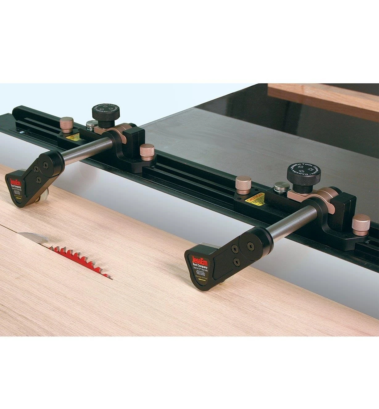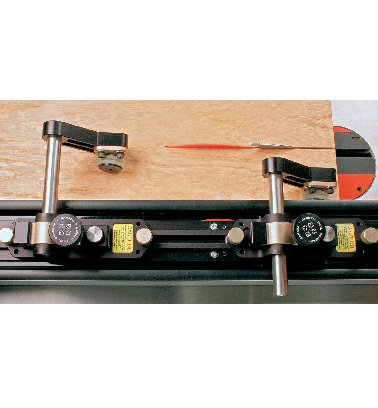 To restrict lift, the fence-mounted guides are spring tensioned to keep them set snug against the top of the stock. The rollers also have a 5° feed bias that helps draw the work inward, keeping it fully registered against the fence.