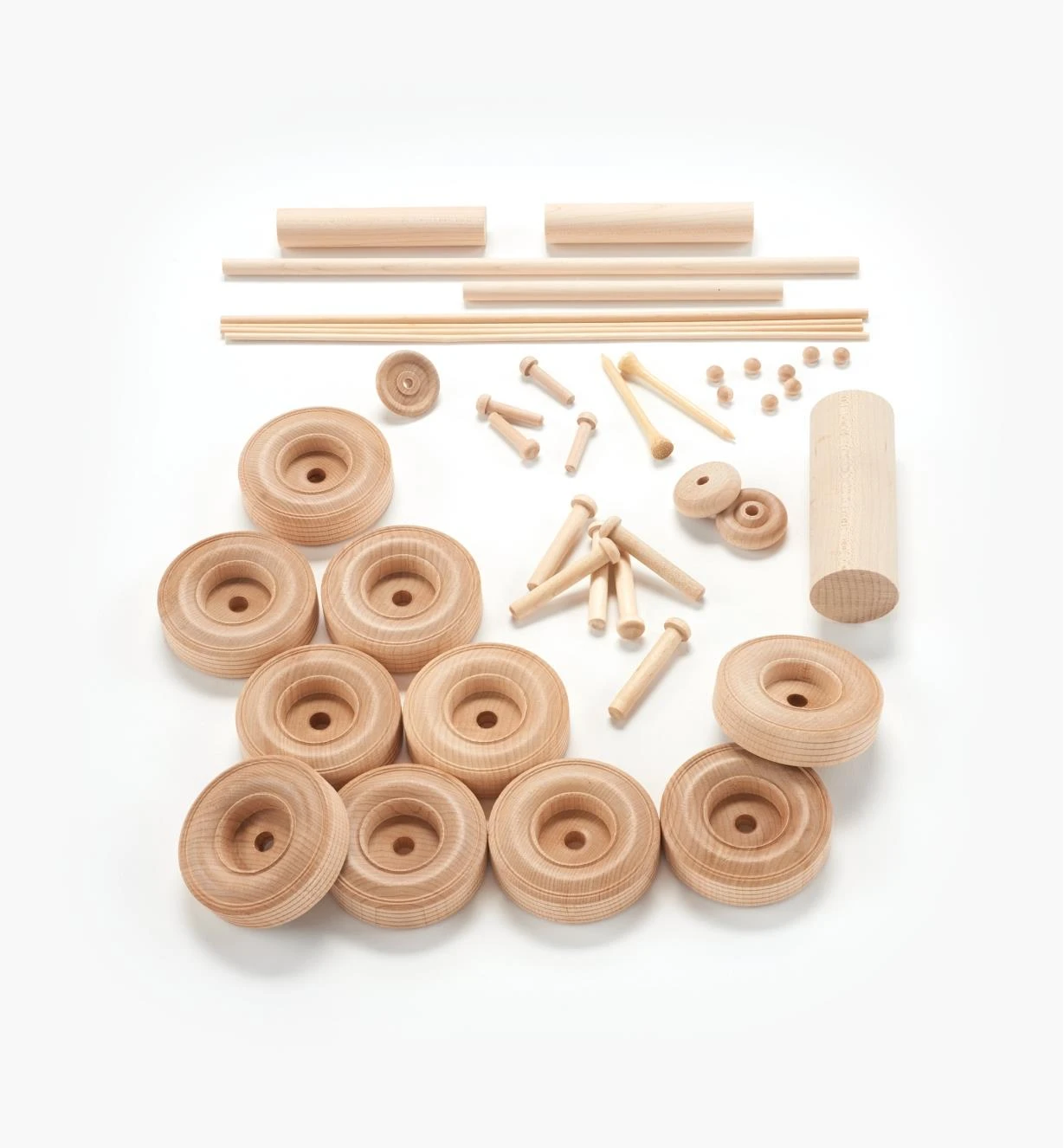 This kit pairs with the toy Kenworth dump truck plan by Toys and Joys (available separately). It contains parts such as dowels, wheels, headlights, etc.