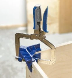 Jaws comprising cast aluminum V- and wedge-clamp pads grip the inner and outer surfaces of the pieces forming the 90Ëš join, aligning them squarely together. A cut-out allows you to drive in a fastener such as a nail or a pocket-hole screw without having to remove the clamp.