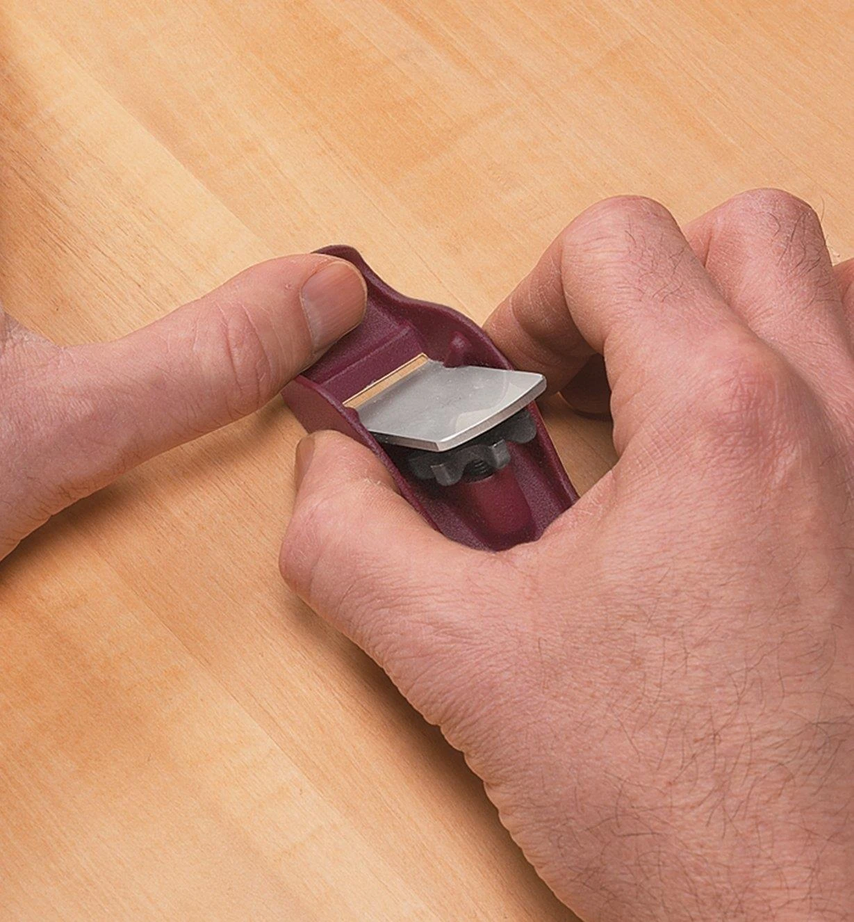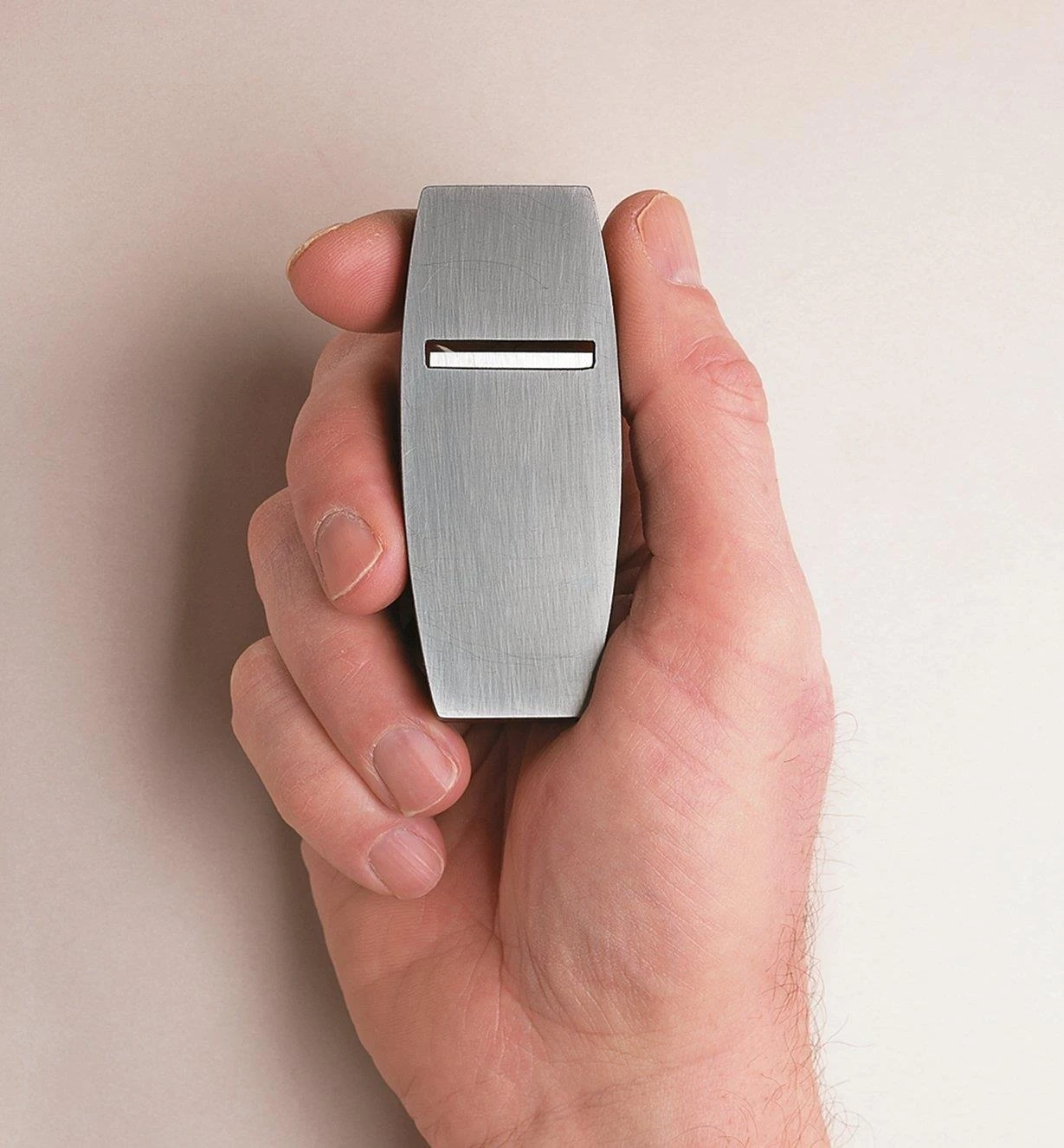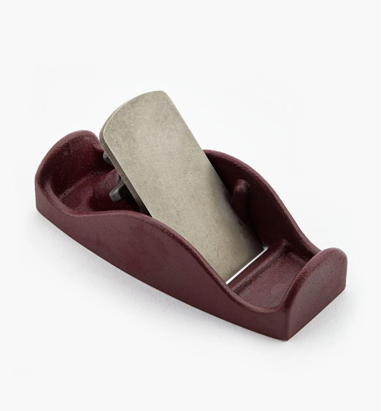 A simple and effective tool with an elegant design, it is a great miniature-maker’s or modelmaker’s plane. For a highly controlled cut on a flat surface, it can be pushed with a thumb on the lipped toe while the palm of the hand is firmly planted on the work, similar to using two hands for a paring cut with a chisel.
