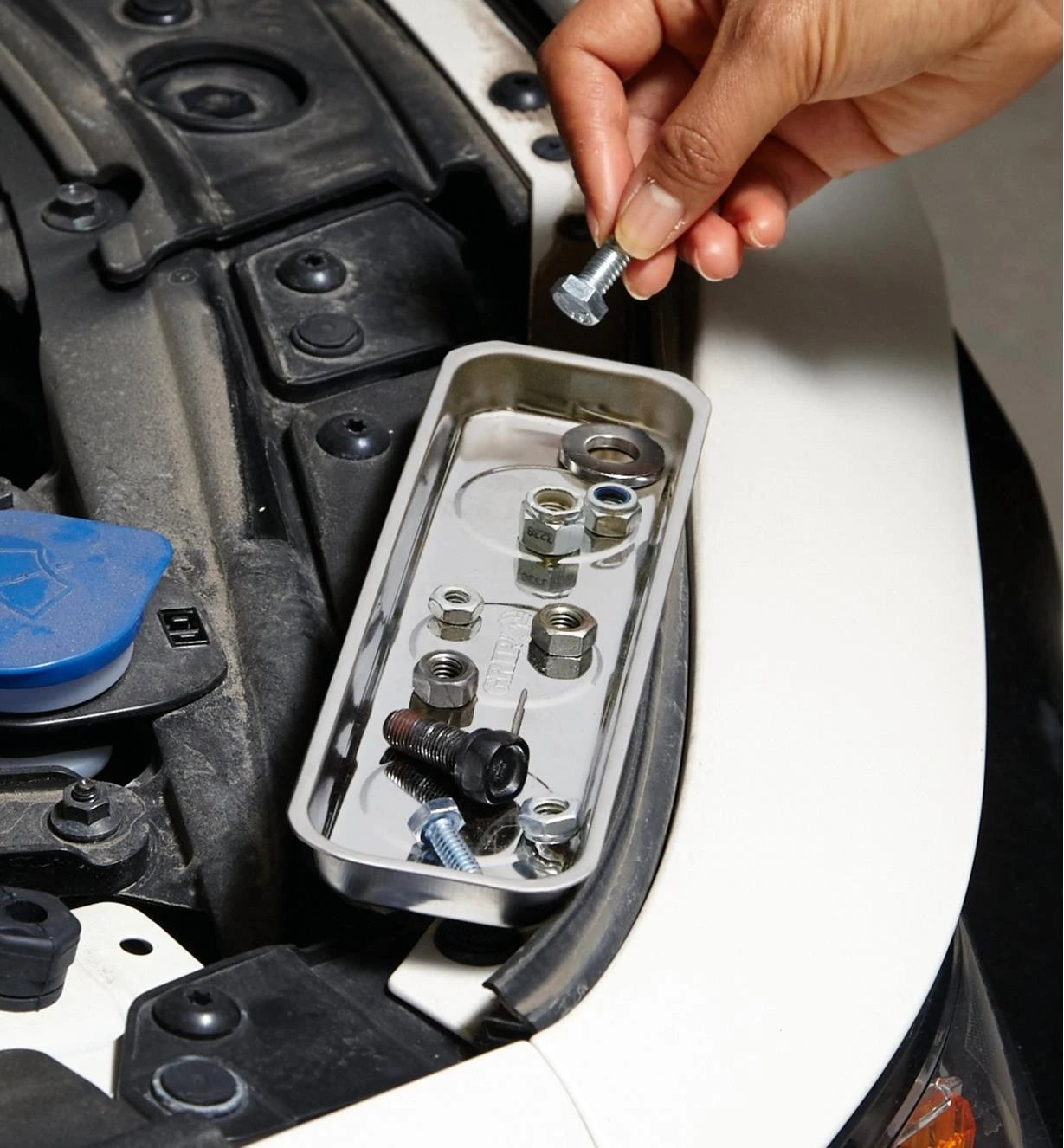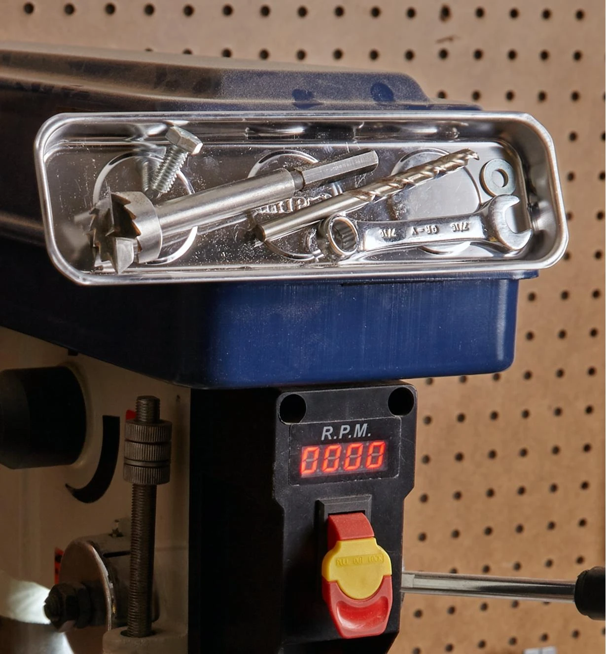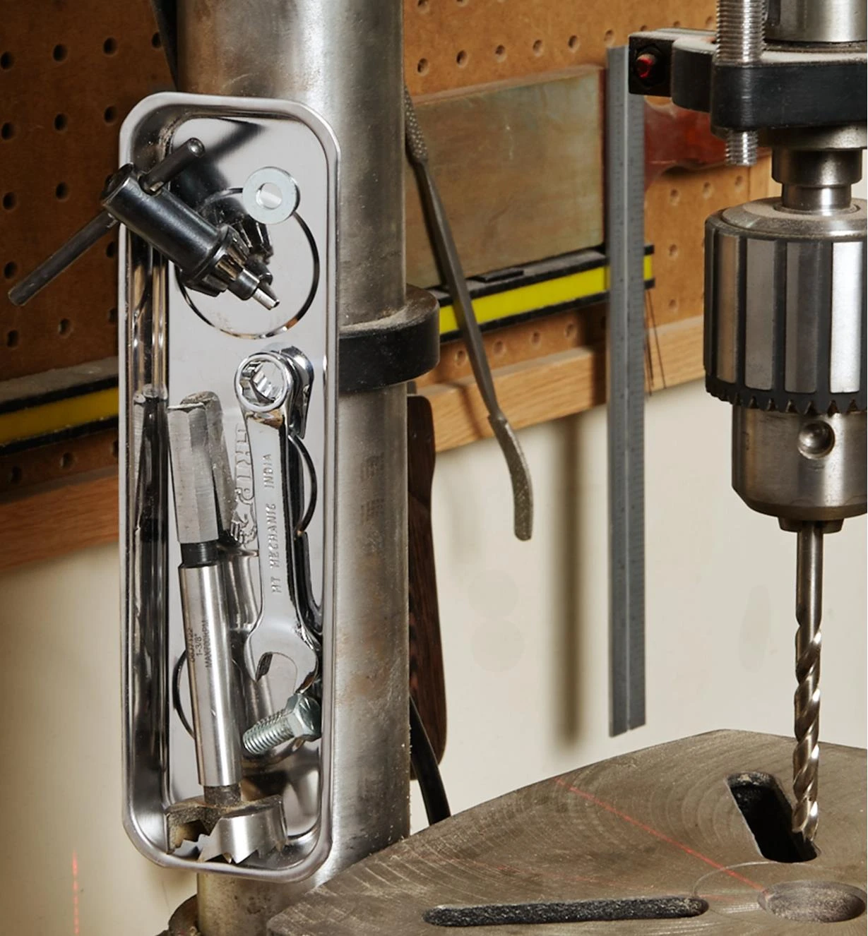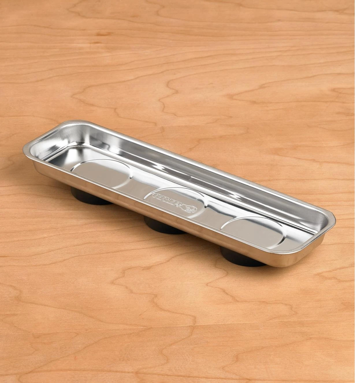 This 9 × 2 1/2″ tool and parts tray uses three powerful magnets to keep a solid grip on small steel parts and tools even if the tray is affixed vertically or upside down. The rubberized base won’t scratch painted surfaces such as a car fender.