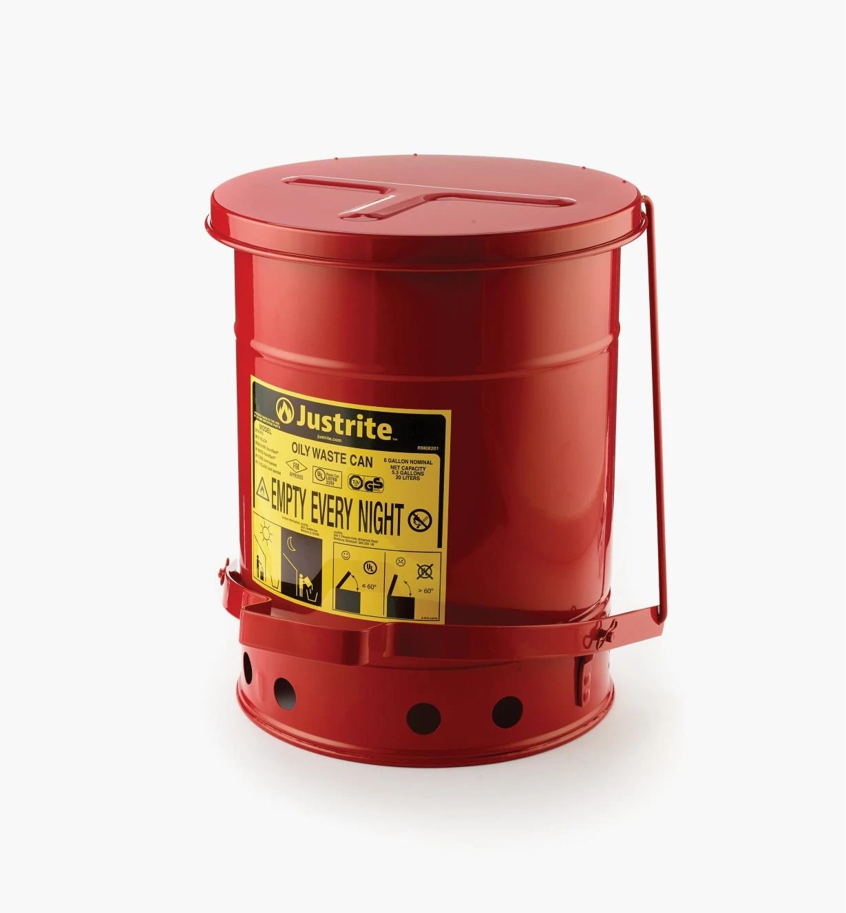 The 6 gallon (23 litre) container is 16″ high by 12″ in diameter, and has a durable powder-coat finish and a carrying handle. It is marked “empty every night” in compliance with safety regulations for certain work areas. Check your local hazardous-waste collection site for information on rag disposal.