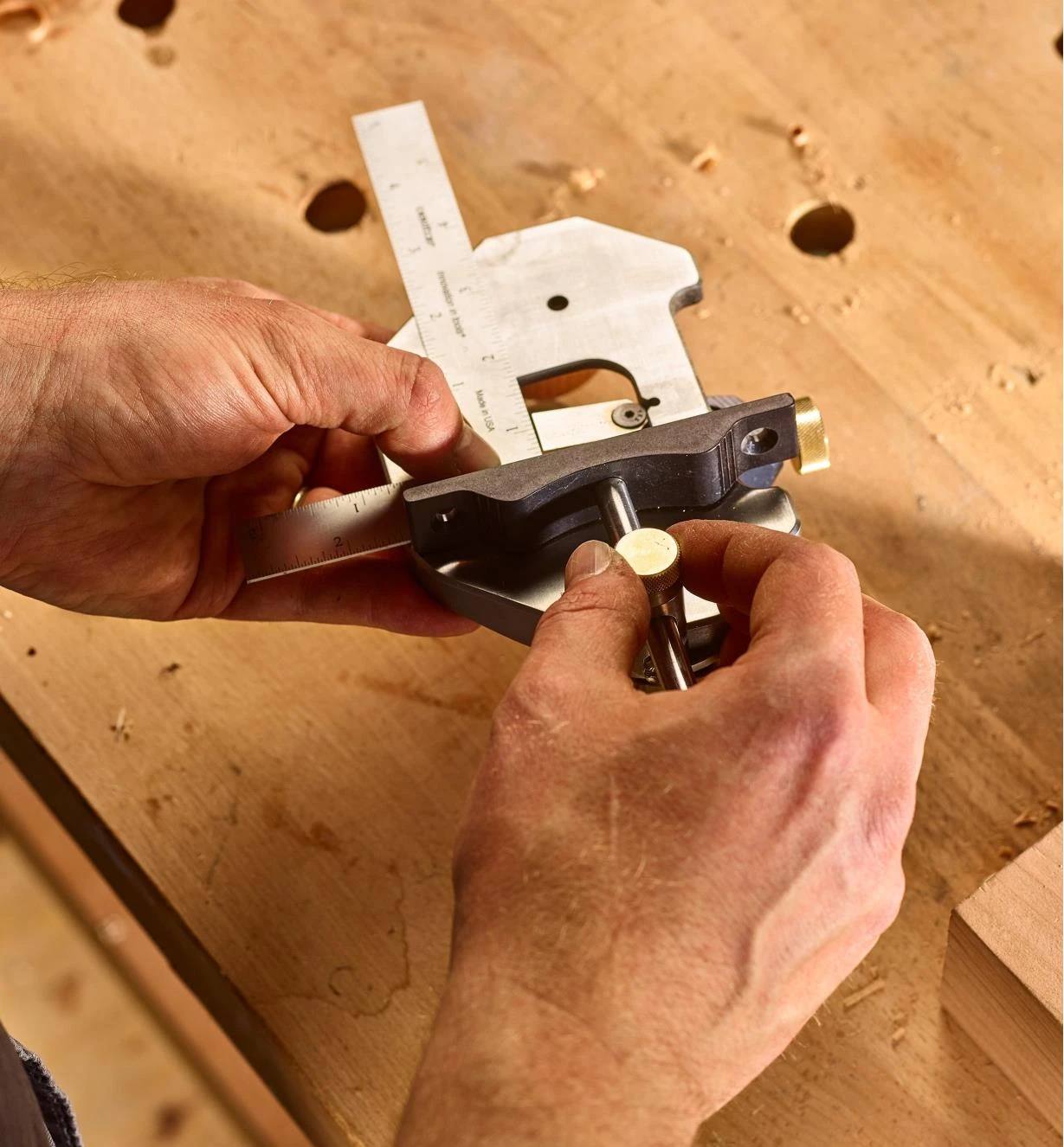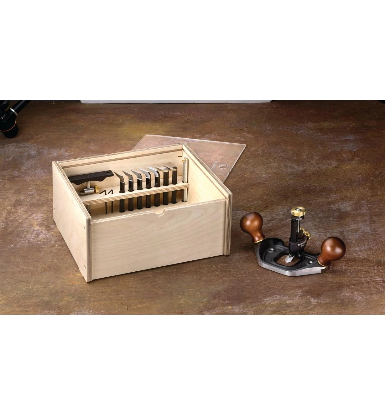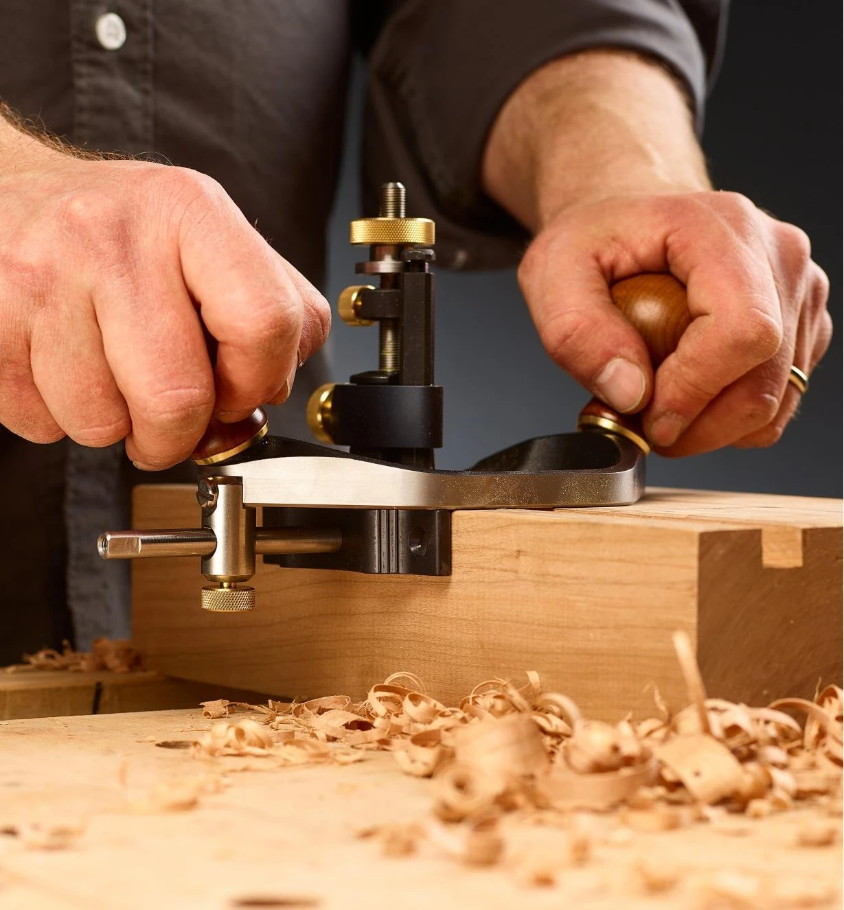 The optional fence for the Veritas large router plane, made of stainless steel and aluminum, can be positioned on either side of the plane and will work on both straight and curved pieces.