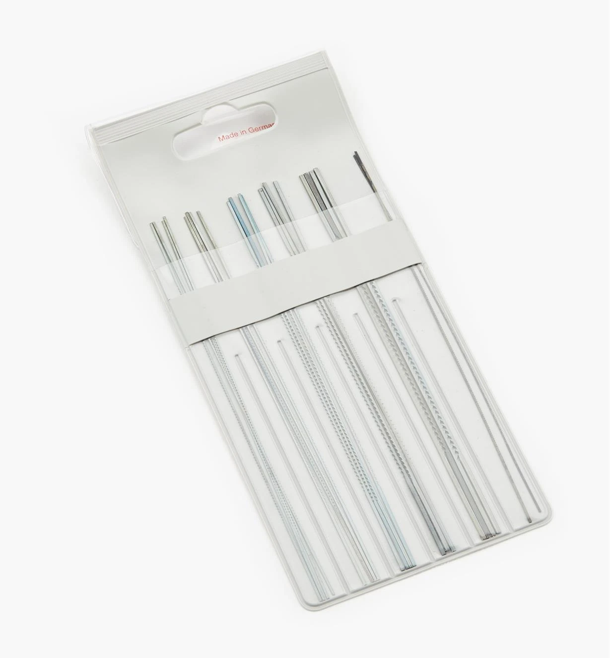 This assortment of 22 blades contains four each of woodworking skip-tooth blade #s 1, 3, 5, 7 and 9, plus two metalworking blades (#1 and #3). Blades are 5″ long and supplied in a plastic wallet. For use in fret saws only.