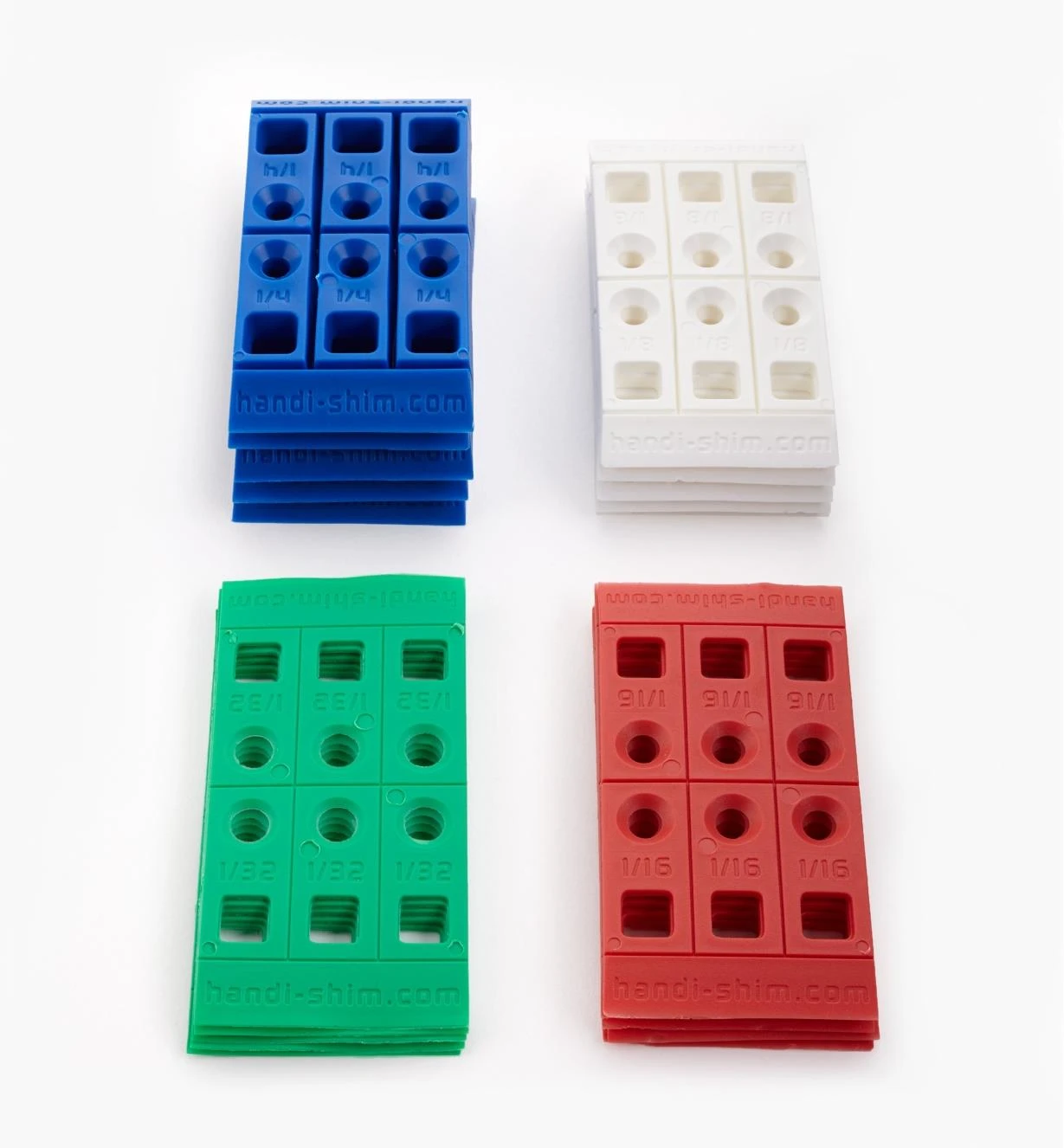 Assortment includes 1/32″, 1/16″, 1/8″ and 1/4″ thick shims (10 of each), all color-coded and stamped to identify the size you need at a glance.