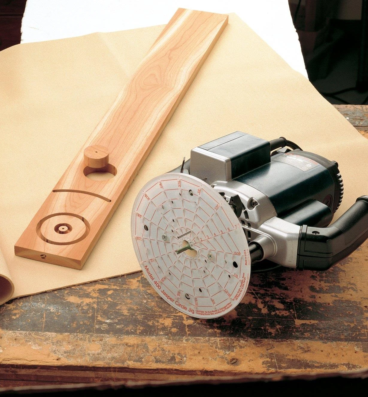 Designed to fit 25 different plunge router models, the jig (constructed from 1/4″ clear acrylic with silk-screened markings) comes complete with mounting hardware, instructions and pivot pin. An excellent product. (Router not included.)