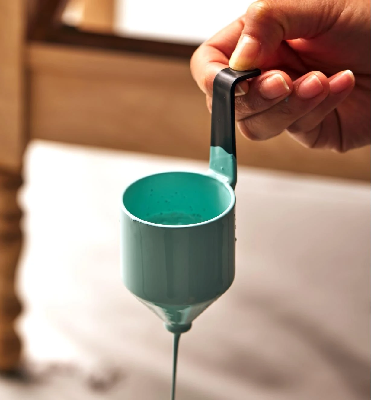 A replacement flow-through viscosity cup for use with the Earlex spray station.