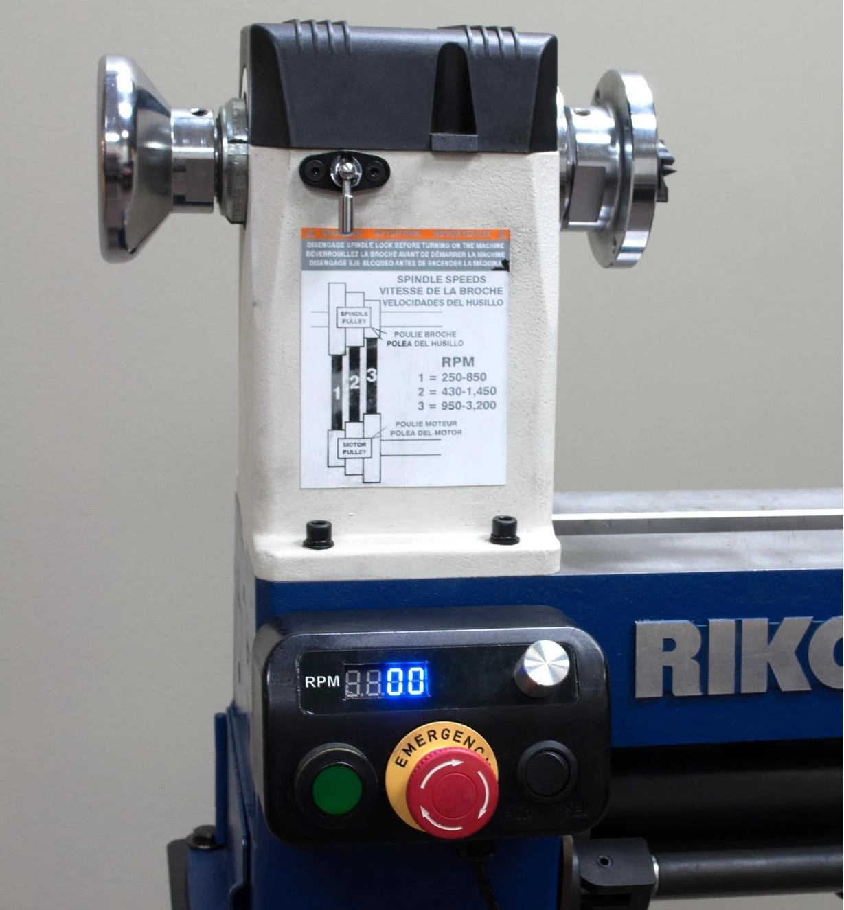 The control box has a magnetic back so you can mount it anywhere on the lathe bed for easy access without obstructing your work.