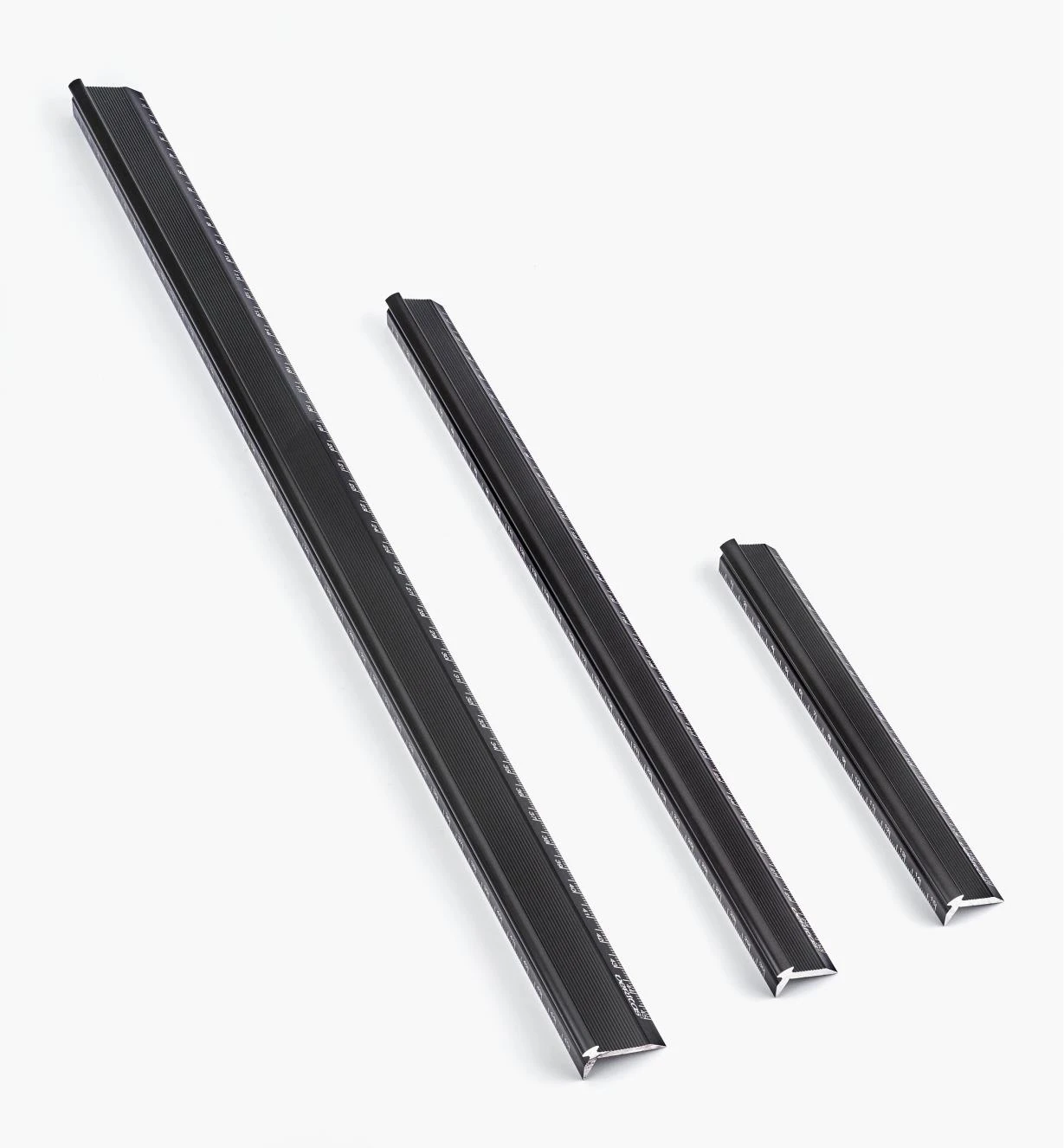 The metric set includes 150mm, 300mm and 450mm lengths. The smaller rules have faces with depths of 3/4″ and 3/8″; the 450mm rule has face depths of 1″ and 7/16″. You can also use the rules on a flat surface – and, since the shape makes them much easier to pick up than a flat rule, you may find yourself reaching for them as your go-to rules. The 150mm rule is small enough to fit comfortably in a pocket.