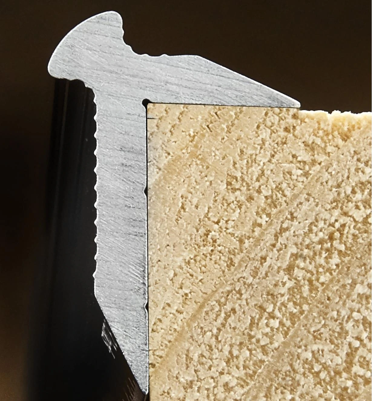 Ours have an acute interior angle to ensure that they seat well, even over saw whiskers, and bevelled edges with etched graduations to minimize parallax errors. This design also simplifies transfer of perpendicular lines from face to edge, and is particularly convenient when holding and marking off dowel rod stock. The wide leg on the L-shaped cross-section is for face work, while the shorter leg is for narrow stock and edge work.