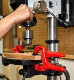 The jaws are shaped to clear projections or accommodate odd shapes, making them particularly useful for holding materials on a drill press, sawhorse or table top. The jaw-release lever is tucked between the handles to avoid accidental triggering.