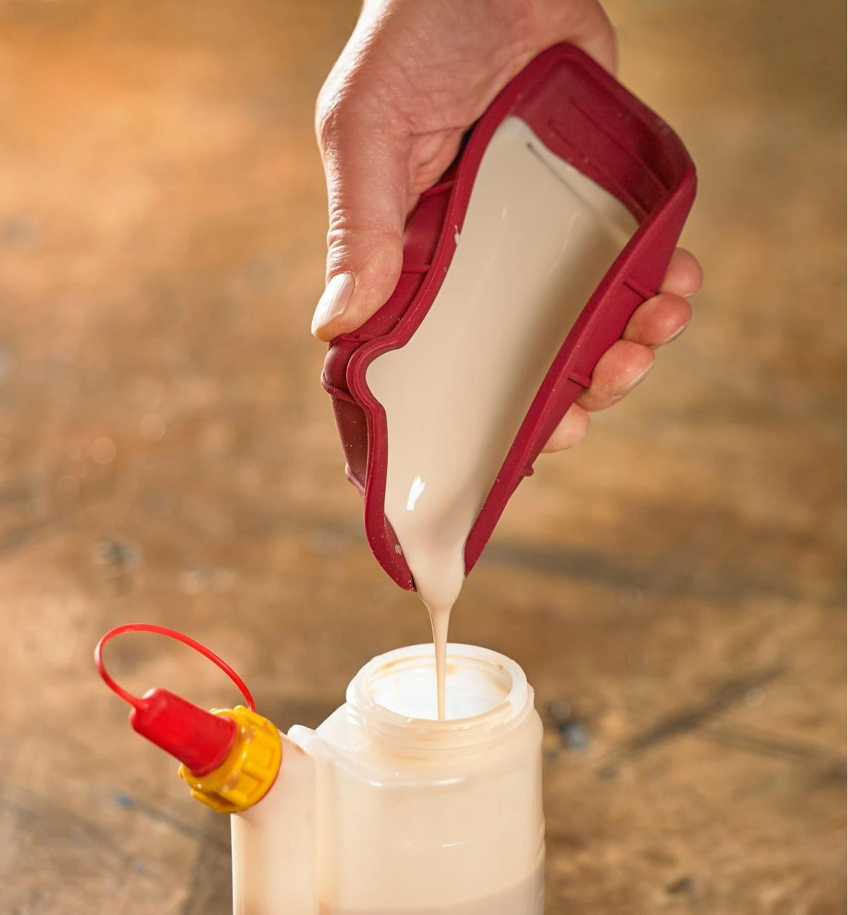 Constructed of 3/16″ thick material, the tray flexes enough that you can readily dispense glue or return a surplus to its container through the pouring lips that double as brush rests. The tray has a ribbed surface for removing excess glue from brushes, and measures about 3 3/8″ wide by 5 1/4″ long by 7/8″ deep.