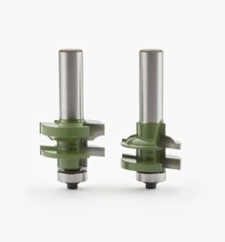 This two-piece rail and stile set has been designed for use with material as thin as 5/8″ (as opposed to the usual 7/8″ or 1″). It cuts a panel slot 3/16″ wide by 3/8″ deep. Complete with pilot bearings, for curved work.