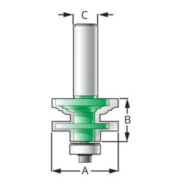 This two-piece rail and stile set has been designed for use with material as thin as 5/8″ (as opposed to the usual 7/8″ or 1″). It cuts a panel slot 3/16″ wide by 3/8″ deep. The bits have a body diameter of 1 3/8”, a depth of 7/8” and a shank diameter of 1/2″. Complete with pilot bearings for curved work.