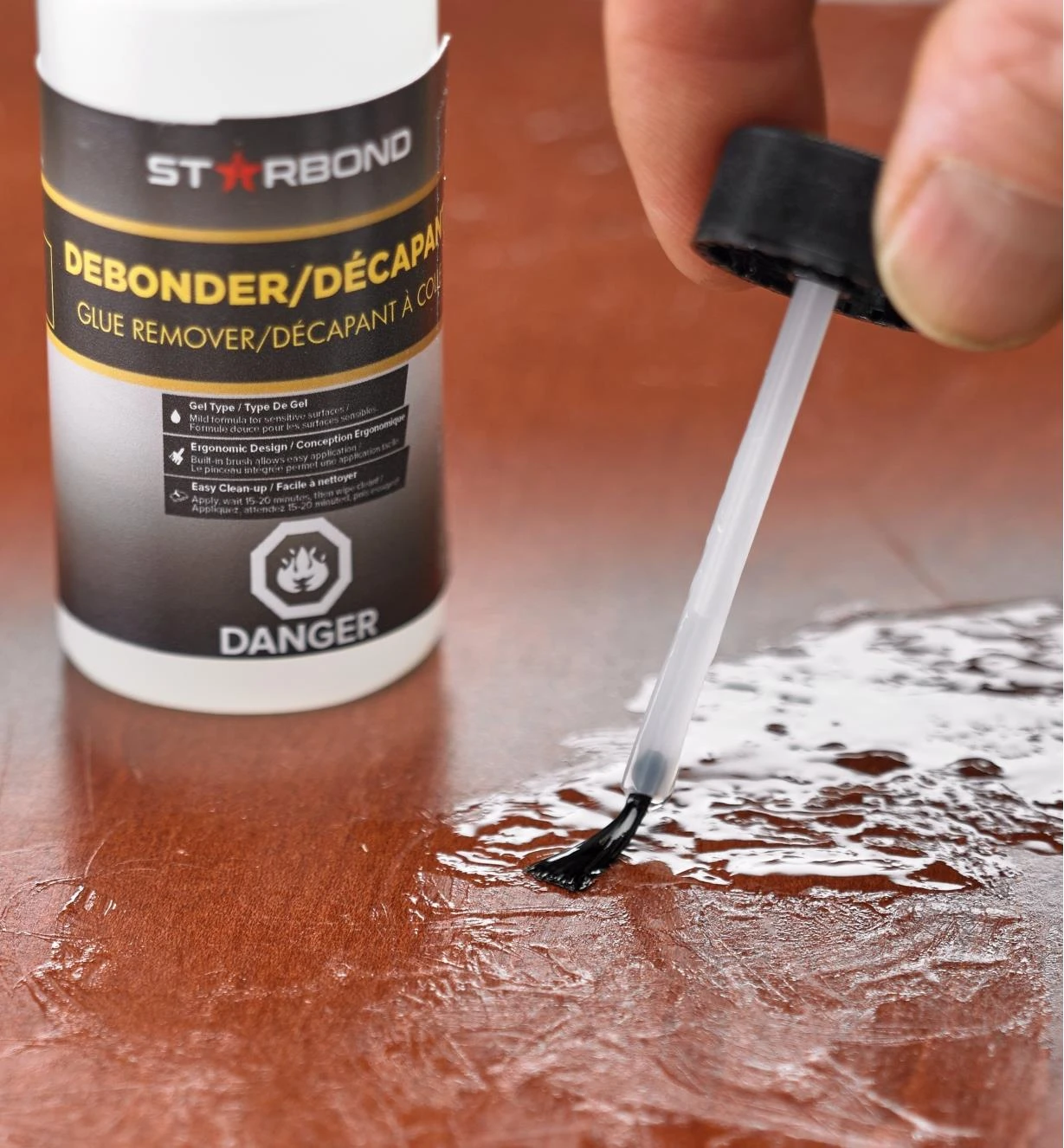 Simply apply the debonder to the dried glue using the applicator brush built into the container’s cap. Just-set glue needs 10 to 15 minutes to loosen; fully cured cyanoacrylate requires 20 to 30 minutes. You can wipe or scrape away the softened residue.