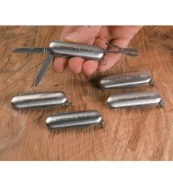This stainless-steel knife has all of the features of its more expensive cousins. Surprisingly, the scissors work well, the fingernail file and cleaner can actually file, and the knife blade cuts (but, like most new knives, it can benefit from a bit of honing if you want it razor sharp). The knife is 2 1/4″ long by 3/4″ wide and weighs 28g (1 oz).