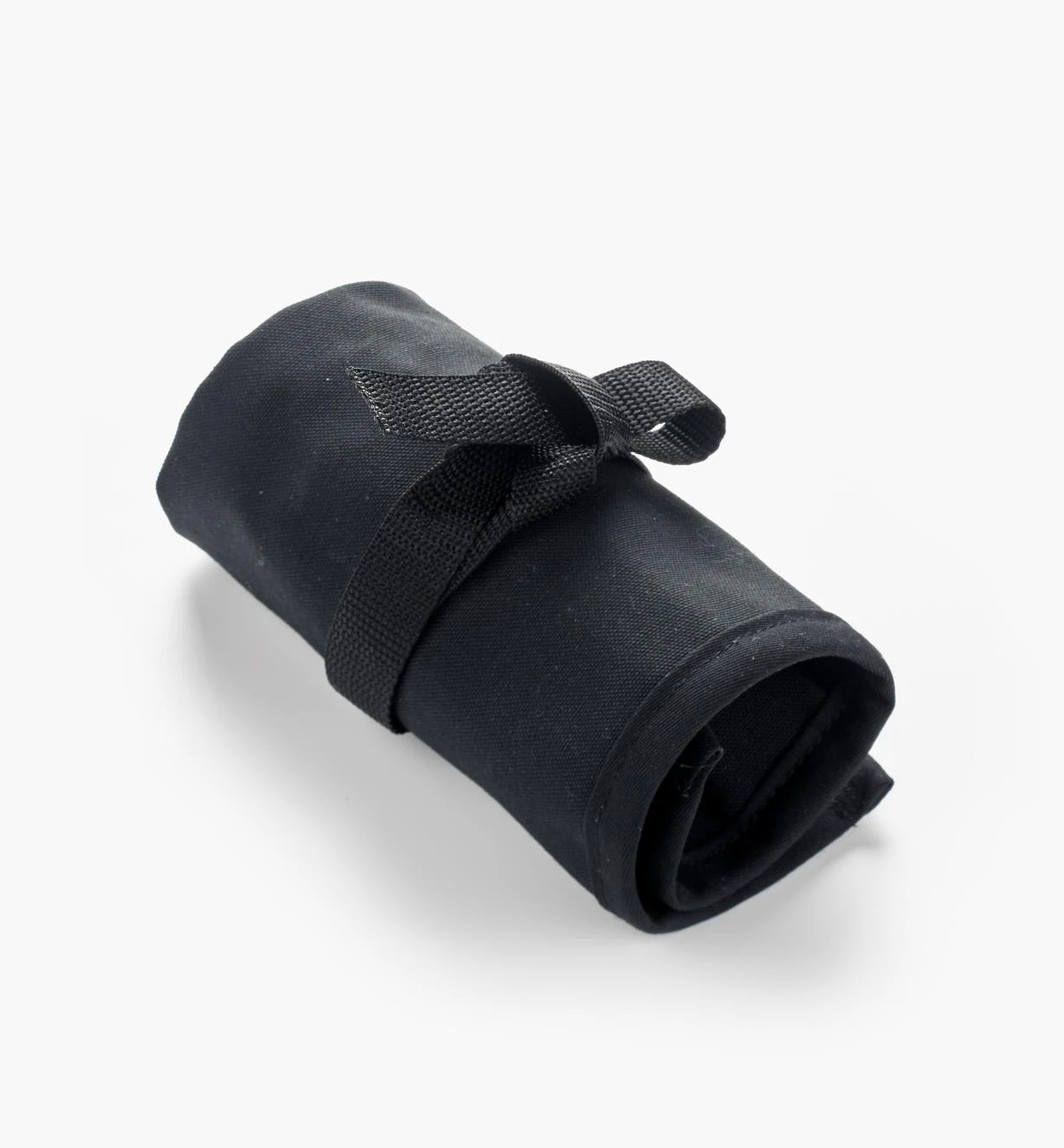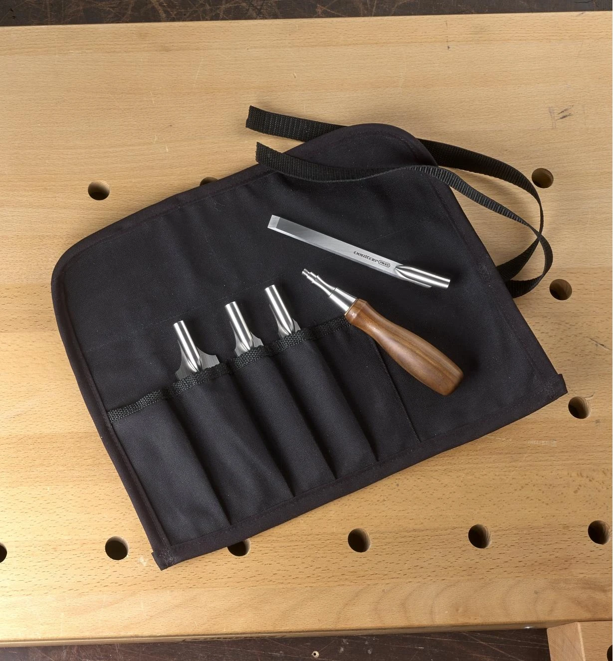 Made of black cotton canvas, this chisel roll holds four Veritas flushing chisel blades and one handle.